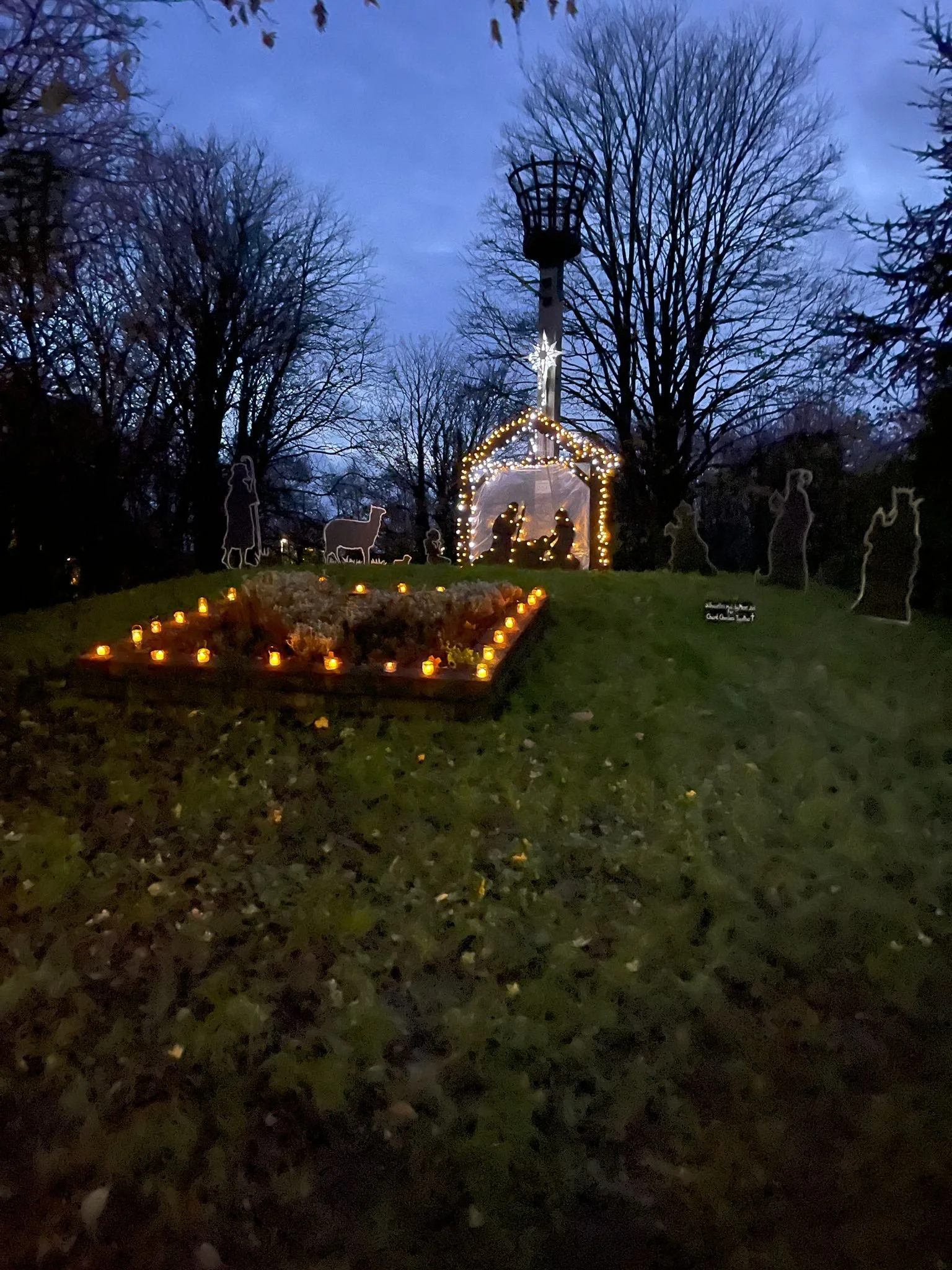 Once there, the group enjoyed hot chocolate, sang carols and gazed upon the illuminated Nativity, accompanied by the angel and two shepherds (played by Alan Nichols and Cris Fendt).